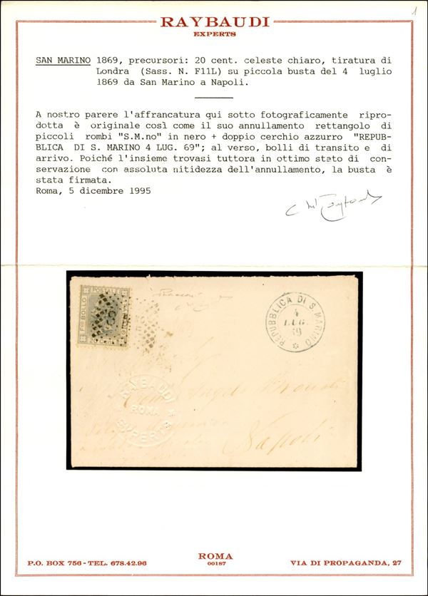 1869 - Precursori - 20 cent (F11L) - bustina per Napoli del 4.7.1869 - Emilio Diena + P. Vaccari + cert. Raybaudi