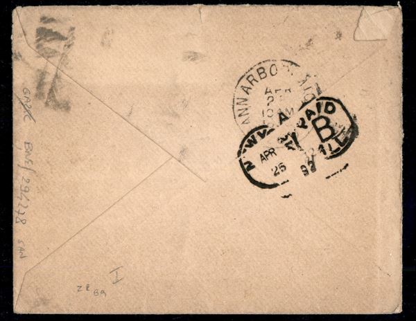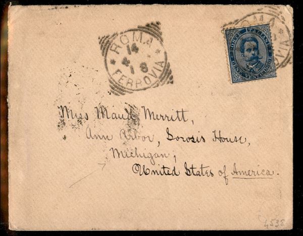 1893 - 25 cent azzurro (40) su busta da Roma 14.4.93 ad Ann Arbor (USA - Michigan) - bollo di arrivo