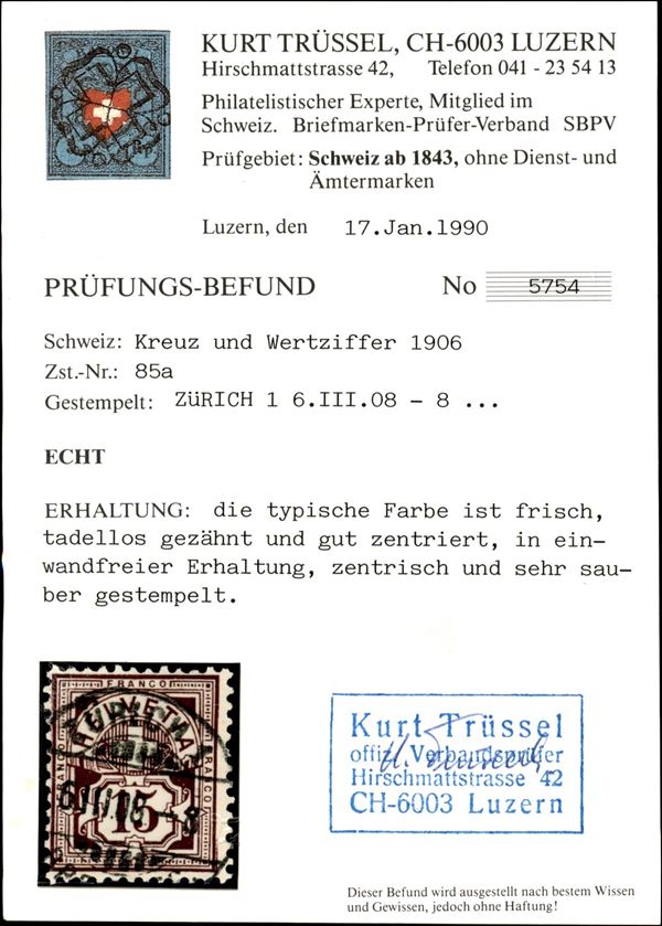 1906 - 15 cent rosso lilla (Michel 87 var Zst. 85a) - usato - cert. Trussel
