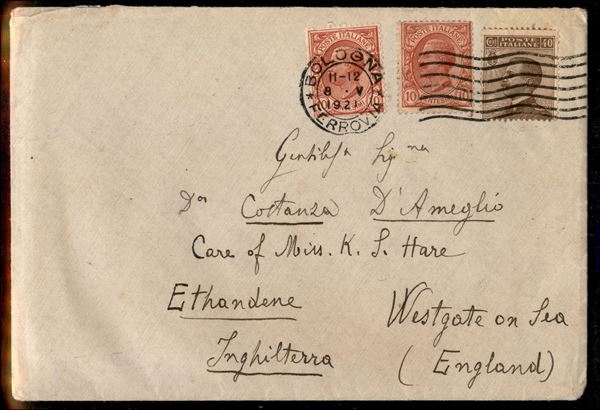 1906 - Due valori 10 cent rosa (82) + 40 cent bruno (84) su busta da Bologna 8.5.21 per la G. Bretagna - ex coll. Provera
