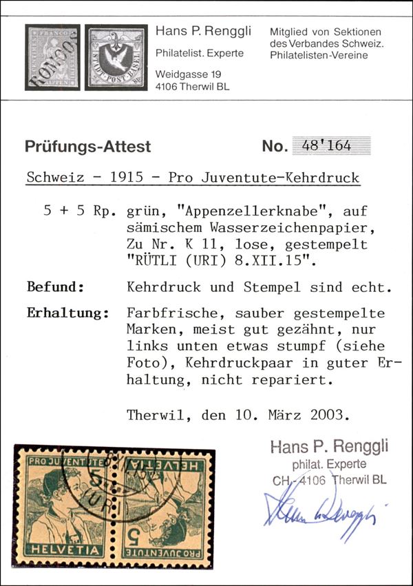 1910 - Tete beche - 5 + 5 cent Pro Juvenute (Zst. K11) - usato - cert. Renggli