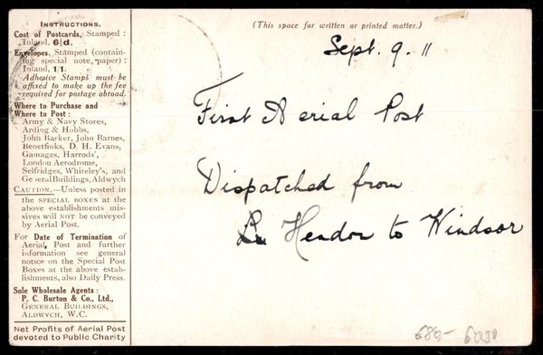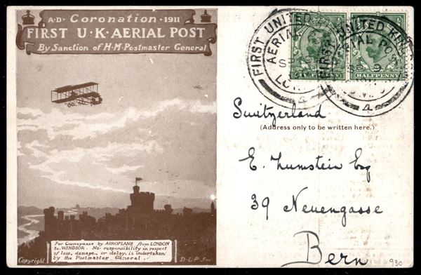 1911 (9 settembre) - First UK Aerial Post - cartolina illustrata dell'evento - primo volo postale tra Londra e Windsor