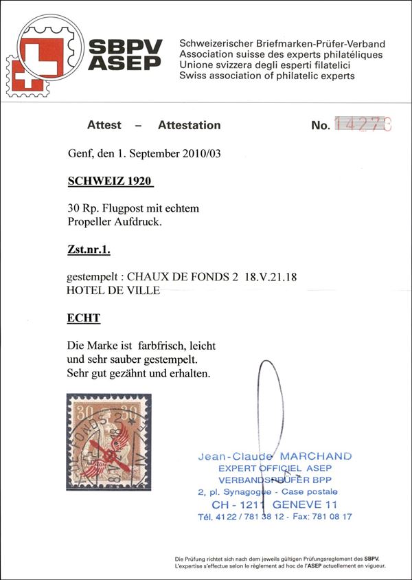 1920 - 30 cent Posta Aerea (Michel 152) annullato CHAUX DE FONDS 2 18.5.21 - cert. Marchand