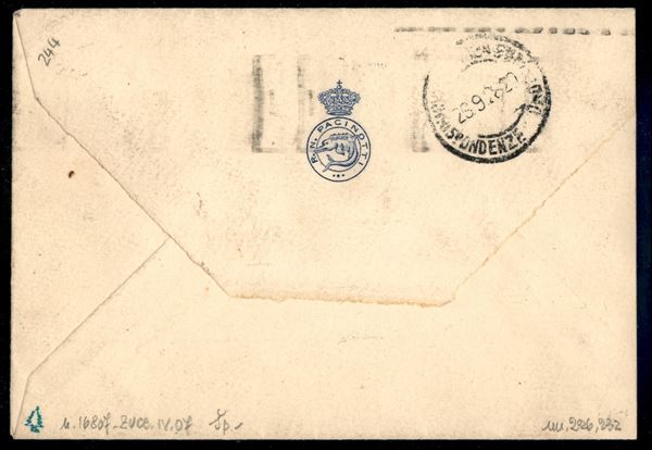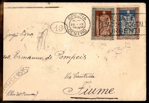 1928 - Em. Filiberto 20 cent bruno e oltremare (226) + 30 cent verde e bruno (232) su busta da Spezia 25.9.28 a Fiume - bollo di arrivo - Raybaudi - ex coll. Provera