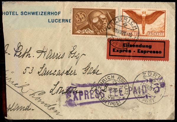 1928 (11 luglio) - Zurigo Londra - 35 cent (181) + 75 cent (190) su aerogramma espresso