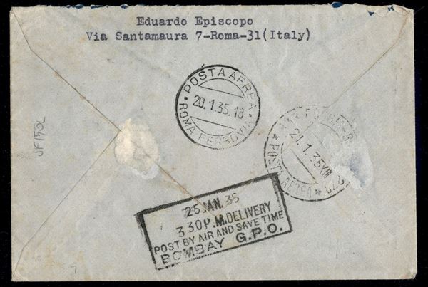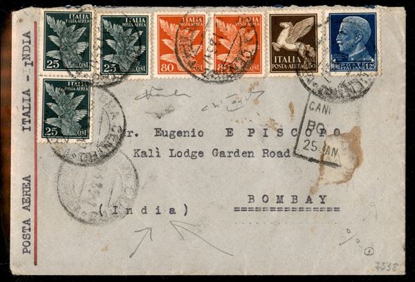 1930 - Tre valori 25 cent verde scuro Aerea (10) + 50 cent bruno Aerea (11) + coppia 80 cent arancio Aerea (13) + 1,25 lire azzurro (253) su busta da Roma 20.1.35 a Bombay - bollo di arrivo - non comune destinazione - Raybaudi