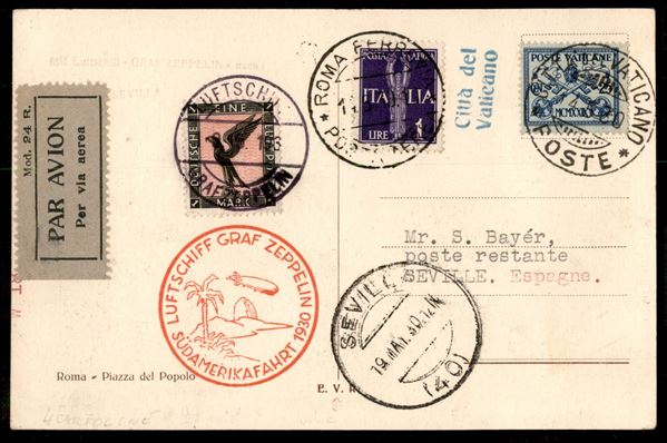 1930 - Zeppelin Sudamerika - Longhi 20 - cartolina con affrancatura mista Vaticano Regno Germania per Siviglia