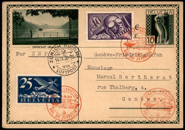 1930 (14 settembre) - Zeppelin - Ginevra Zurigo - 25 cent (180) + 40 cent (182) su cartolina postale