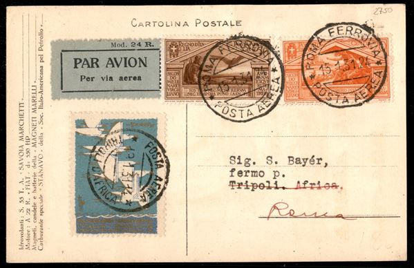 1931 - Roma Tripoli - Cartolina della Crociera Atlantica con etichette commemorative da Roma 15.1.31 a Tripoli - bollo di arrivo
