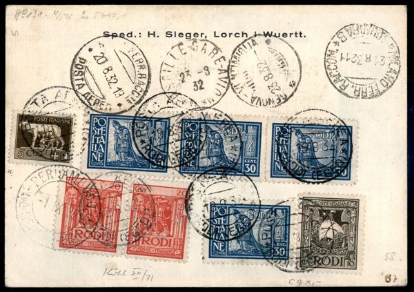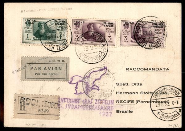 1932 - Zeppelin 5 Sudamerika - Longhi 117 - aerogramma raccomandato con bella affrancatura multipla fronte/retro da Rodi per Recife (Pernambuco) del 19.8.32