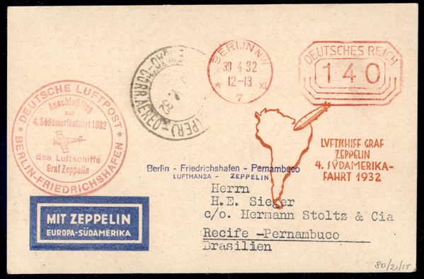 1932 (30 aprile) - Zeppelin 4 Sudamerika - affrancatura meccanica rossa da Berlino a Recife/Pernambuco (Brasile)