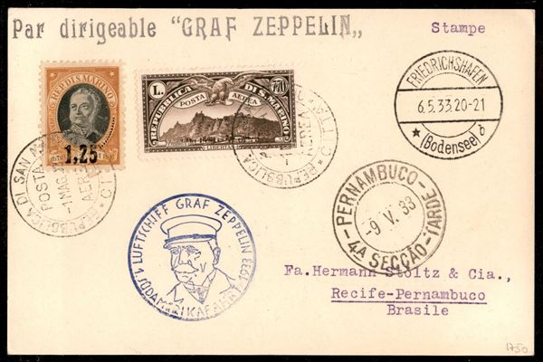 1933 - 1° Volo in Sudamerica - Cartolina da San Marino 1.5.33 a Pernambuco - bollo di arrivo (Longhi 182)