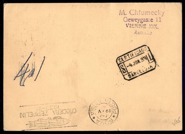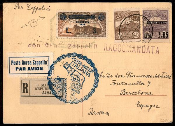 1933 - Volo di ritorno - Cartolina affrancata con Zeppelin 3 lire da San Marino Cittą 26.5.33 e lanciata su Barcellona - bollo di arrivo (Longhi 635)