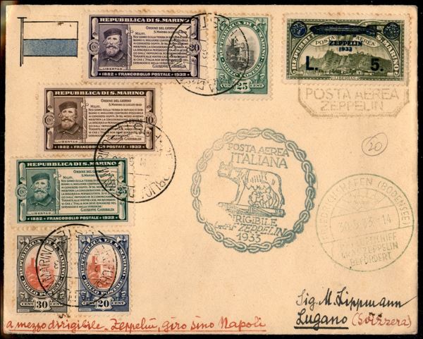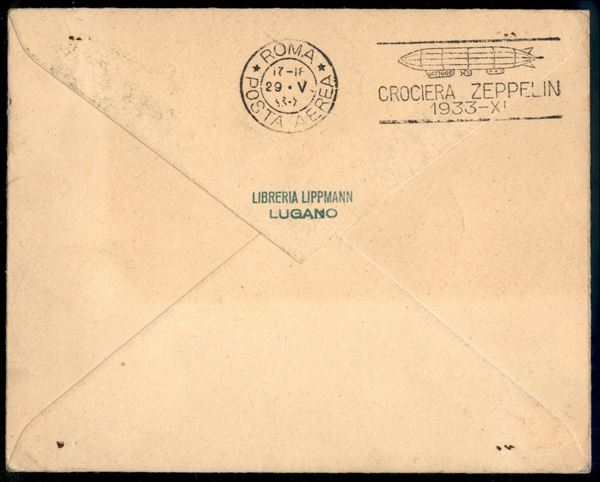 1933 - Zeppelin - Aerogramma affrancato con 5 lire su 80 cent Zeppelin (12) + complementari