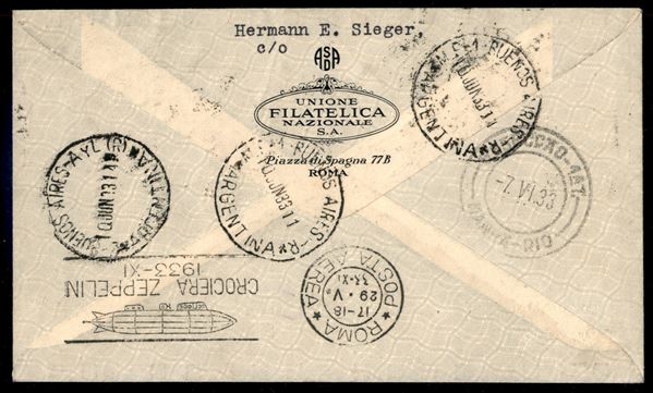 1933 - Zeppelin - Volo di Ritorno - Longhi 530 - aerogramma raccomandato affrancato con 20 lire Zeppelin (50) + complementari da Roma a Buenos Aires del 29.5.33
