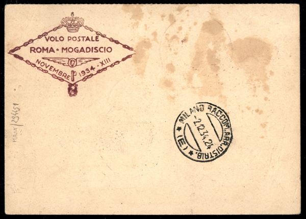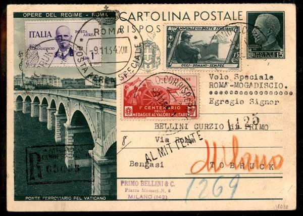 1934 - Roma Mogadiscio - 1 lira violetto (83 - Posta Aerea) + valori complementari su intero postale da 15 cent da Roma 9.11.34 a Tobruk - bollo di arrivo - raro - ED (Longhi 3186)