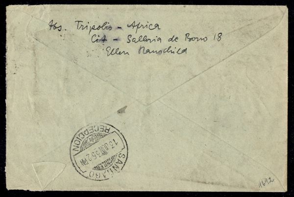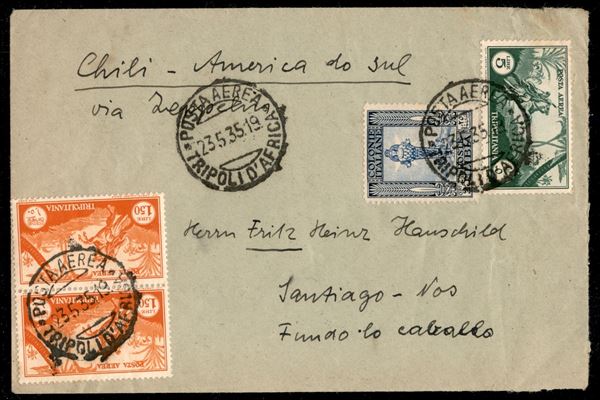 1935 - Coppia 1,50 lire arancio (15 - Posta Aerea) + 5 lire verde (16 - Posta Aerea) + Libia 25 cent azzurro su busta da Tripoli 23.5.35 a Santiago - bollo di arrivo di questa non comune destinazione