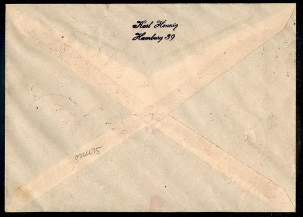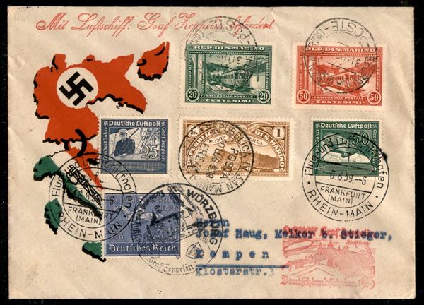 1939 - Volo a Wurzburg (Longhi 965) - affrancatura mista con Germania su busta da S. Marino 6.7.39 a Kempem - bollo di arrivo