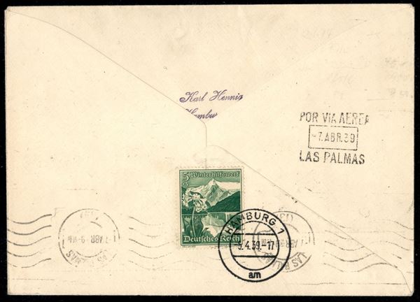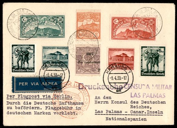 1939 - Volo in Sud America (cachet in rosso) - affrancatura mista con Germania su busta da S. Marino 10.2.39 a Las Palmas, via Amburgo - bollo di arrivo
