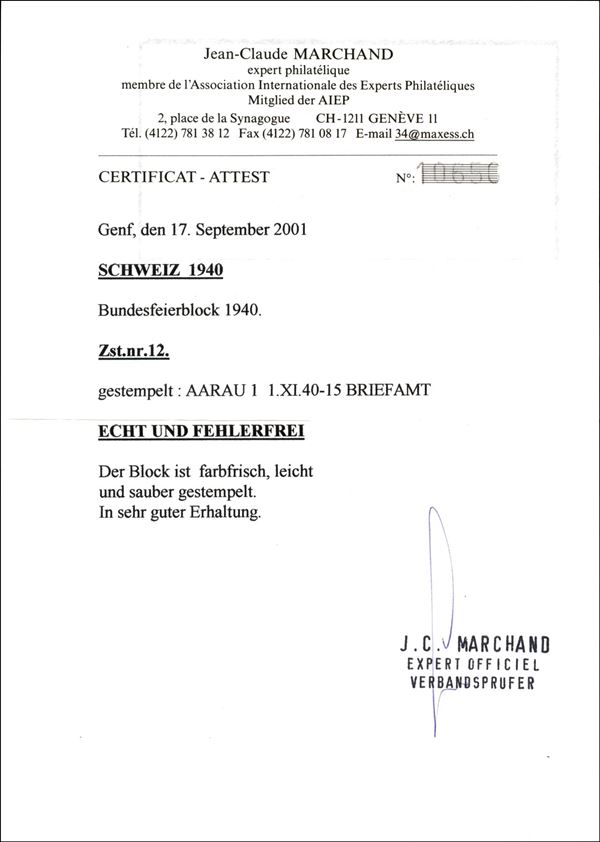 1940 - Foglietto Pro Patria (B5) - AARAU 1.11.40 - cert. Marchand