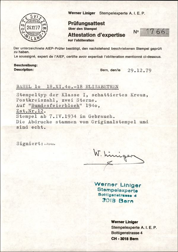1940 - Foglietto Pro Patria (B5) - Basel 10 18.11.40 - cert. Liniger