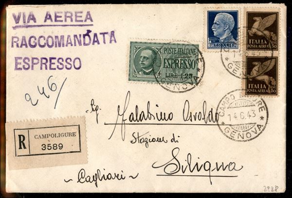 1943 - 50 cent bruno Aerea (11) in coppia + 1,25 lire azzurro (253) + 1,25 lire verde Espressi (15) su busta da Campo Ligure 14.6.43 a Siliqua - bollo di arrivo