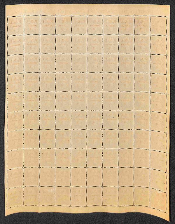 1945 - Intero foglio del 50 cent + 3 lire P.S.I. (4) - 100 esemplari con i relativi errori di composizione - margini integri - gomma integra