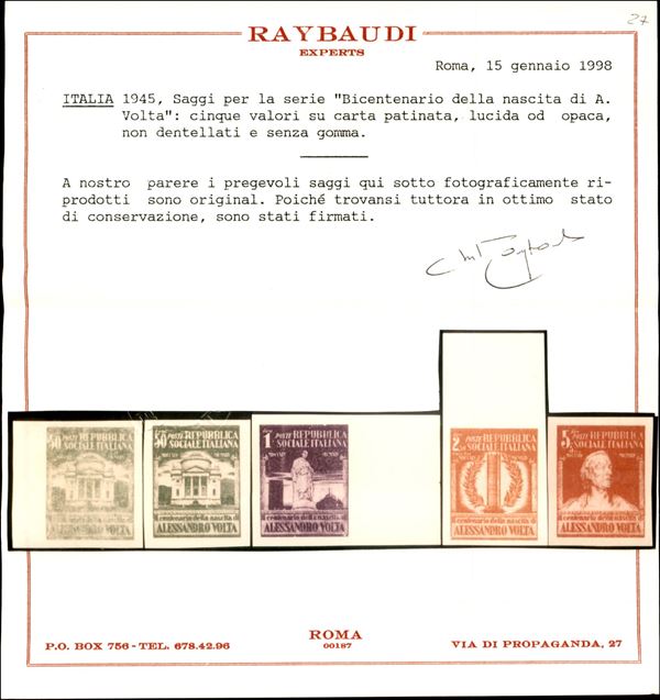 1945 - Pregiata serie di Saggi per la serie Bicentenario della nascita di A. Volta - 5 valori - senza gomma - cert. Raybaudi