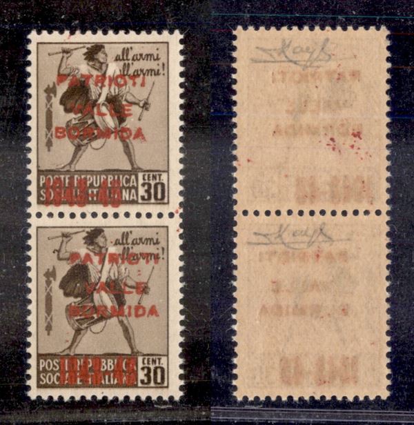 1945 - Soprastampa vermiglio - 30 cent (4A) in coppia verticale con soprastampa superiore spostata a sinistra (varietà c) - gomma integra - non catalogato - Raybaudi