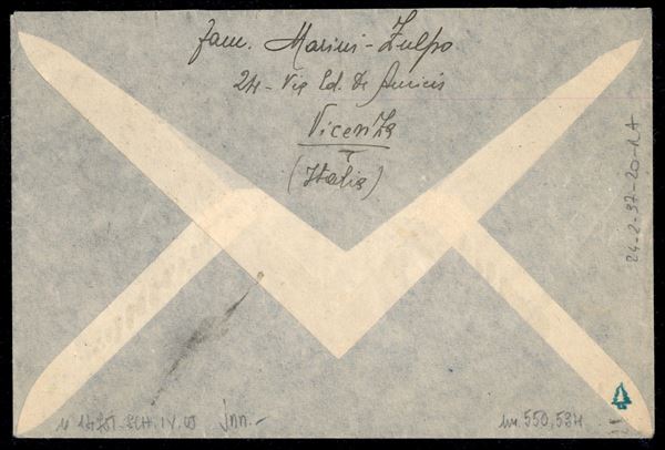 1946 - 5 lire rosso (257) in blocco di sei + 1 lira verde grigio Democratica (550) su busta da Vicenza 11.4.46 a New York - ex coll. Provera