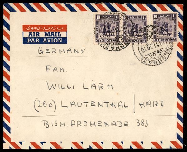 1950 - 10 mills violetto (7) - tre valori su cartolina da Bengasi 29.11.50 a Lautenthal