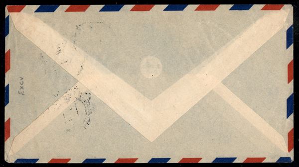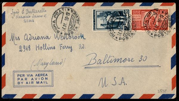 1950 -100 lire carminio scuro (565) + 15 lire azzurro (560) su busta da Roma 24.11.50 a Baltimora