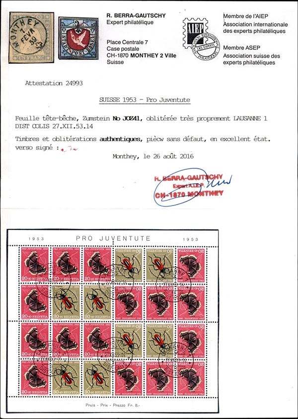 1953 - Foglietto 20 + 30 tete beche Pro Juvenute (Zst. JOZ41) - annullato Losanne 27.12.53 - cert. Gautschy