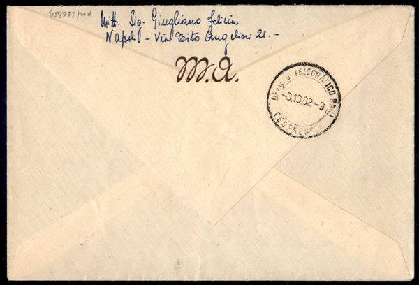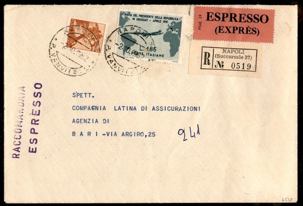 1962 - Gronchi 185 lire verde grigio (919) + Michelangiolesca 5 lire bruno si busta da Napoli 21062 a Bari - bollo di arrivo - raro uso per interno