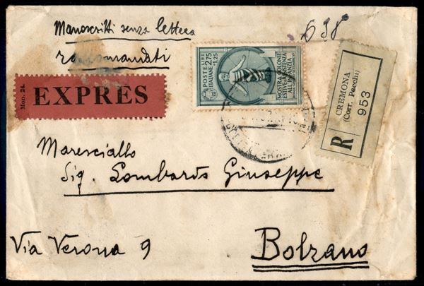 2,75 lire + 1,25 lire Colonie Estive (414) - bordo foglio - isolato su raccomandata espresso da Cremona a Bolzano del 28.7.37 - busta con pieghe e ingiallimenti sul valore
