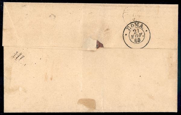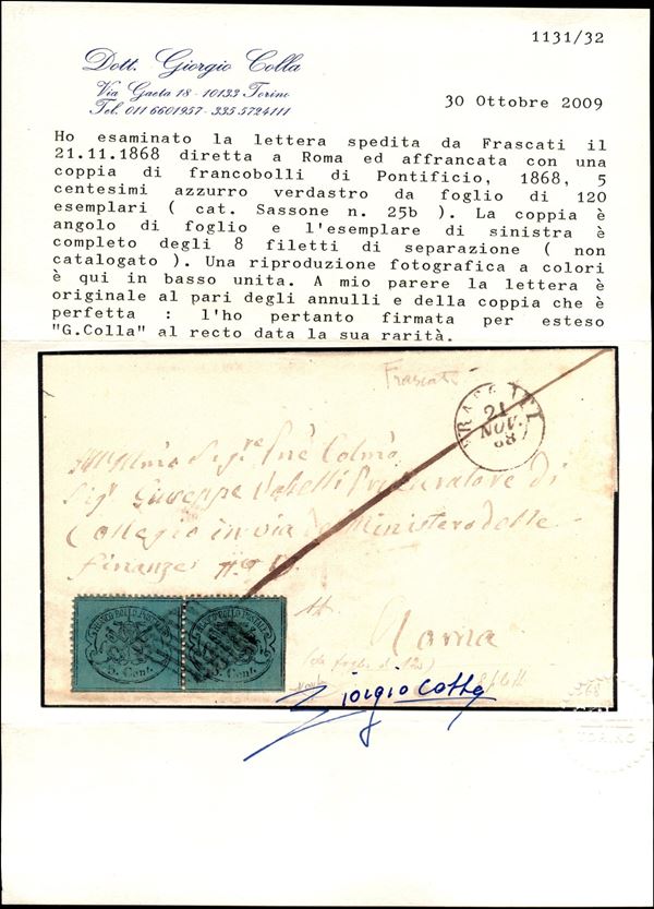 5 cent (25b - pos. 119/120) - coppia angolare con doppi filetti completi (8 nel pezzo di sinistra) - lettera da Frascati a Roma del 21.11.1868 - A. Diena + M. Raybaudi + cert. G. Colla