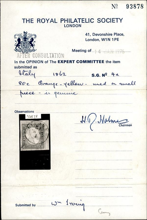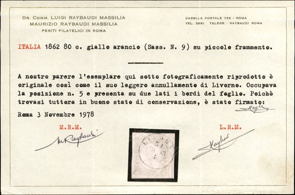 80 cent giallo arancio (4) angolo di foglio (pos 5) usato a Livorno 31.8.63 su frammento - Mezzadri + cert Royal + cert M.L. Raybaudi