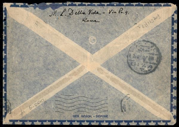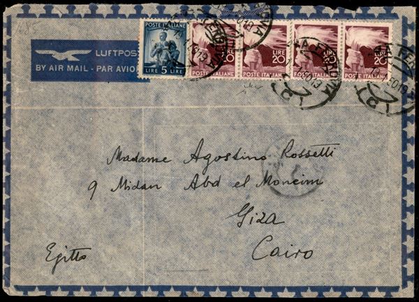 Aerogramma affrancato con 2 coppie orizzontali del 20 lire + 5 lire Democratica (555 + 561) da Roma per Giza (Cairo) del 19.1.50