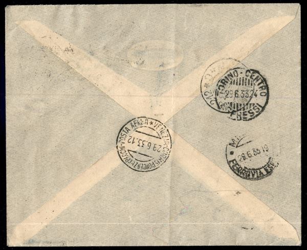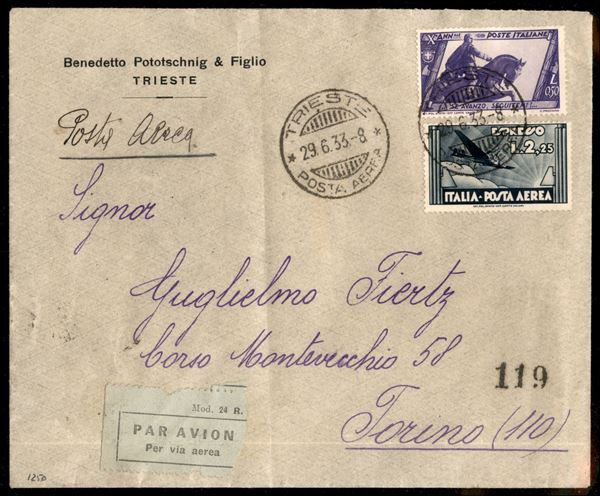 Aerogramma affrancato con 2,55 lire Espresso Aereo (44) + complementare 50 cent Marcia su Roma (392) da Trieste per Torino del 29.6.33
