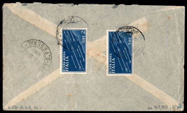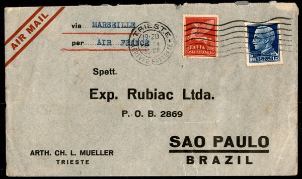 Aerogramma affrancato con due 2 lire (al retro) + 10 lire Imperiale (Aerea 15 + 17) + complementare 1,25 lire Imperiale (253) da Trieste per San Paolo (Brasile) via Marsiglia del 18.1.35 - ex coll. Provera
