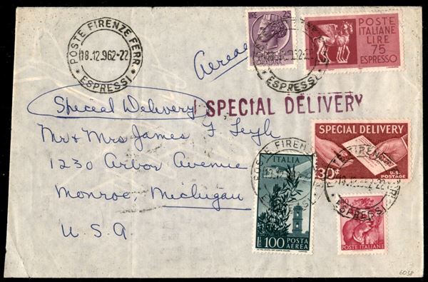 Aerogramma affrancato con due Espressi 75 lire Cavalli Alati (34) + 30 cent Espresso Stati Uniti + 100 lire Campidoglio (142) e complementari (769 + 911) da Firenze a Monroe (Michigan) del 18.12.62 - insolita e interessante