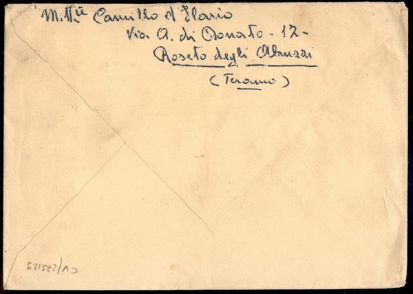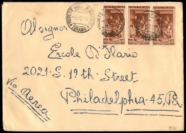 Aerogramma affrancato con striscia di tre 100 lire Italia al Lavoro (651) da Roseto degli Abruzzi per Philadelphia (USA) del 9.12.52