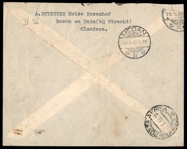 Aerogramma affrancato con tre 50 cent Garibaldi Aerea (32) + 3 lire Dante Aerea (28) da Roma per Soerabaia (Java) del 30.4.32 - timbri di transito e d'arrivo