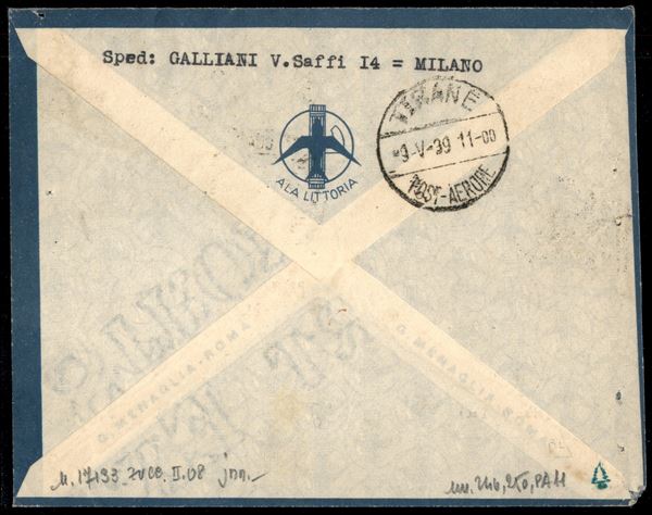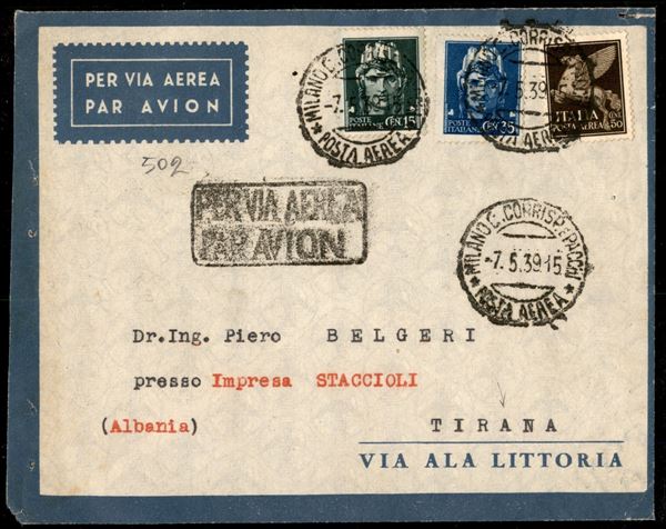 Aerogramma con affrancatura tricolore Imperiale 15 cent + 35 cent + 50 cent Aerea (246 + 250 + A11) da Milano per Tirana del 7.5.39 - ex coll. Provera