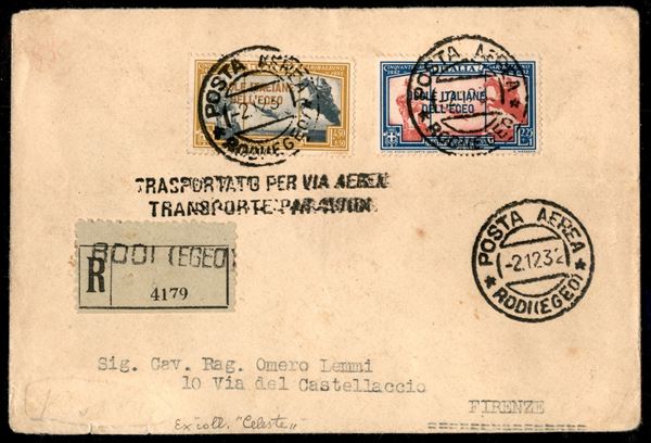 Aerogramma raccomandato affrancato con Espressi Aerei (19/20) da Rodi per Firenze via Brindisi del 2.12.32 - ex coll. Celeste