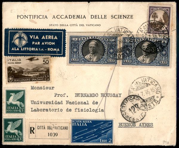 Aerogramma raccomandato inizialmente affrancato con due 1,25 lire + un 50 cent Medaglioni (29 + 25) successivamente implementato con due 5 lire Aerea + 50 cent + 2 lire (Rewgno A15 + A16 + A96) per poter viaggiare via aerea - affrancatura mista non filatelica da Cittą del Vaticano per Buenos Aires del 31.7.36
