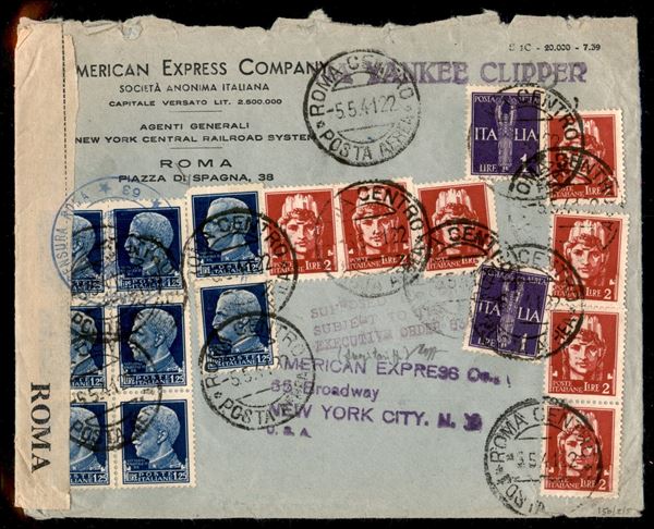 Aerogramma via Yankee Clipper con affrancatura multipla Imperiale (Ordinaria otto 253 + sette 255 + Aerea due 14) da Roma per New York del 5.5.41 - cert. Caffaz