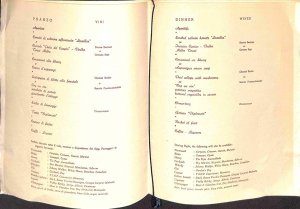 Alitala volo New York Roma - menů di bordo 1° classe