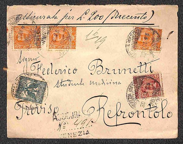 Assicurata con affrancatura tricolore della Floreale (70 + 71 + tre 72) da Venezia a Refrontolo del 30.3.03 - sigilli al verso