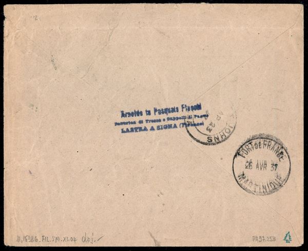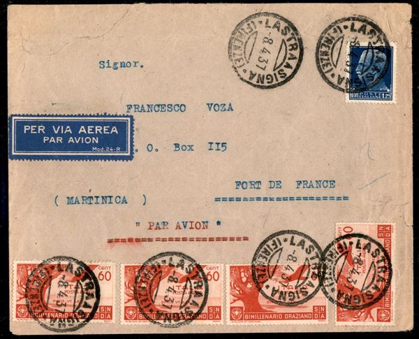 Bella lettera via aerea per la Martinica da Lastra a Signa 8.4.37 a Port de France affrancata con Imperiale 1,25 lire azzurro + Orazio Aerea quattro esemplari 60 cent rosso (253 + Aerea 97) - ex coll. Provera